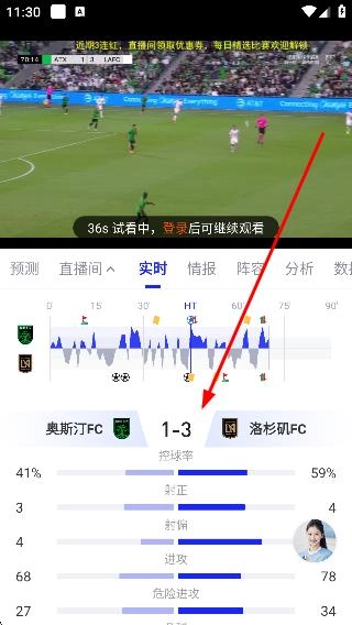 4、在实时页面能够查看赛事实时比分、控球率等数据,例如奥斯丁FC1-3洛杉矶FC的实时赛况。