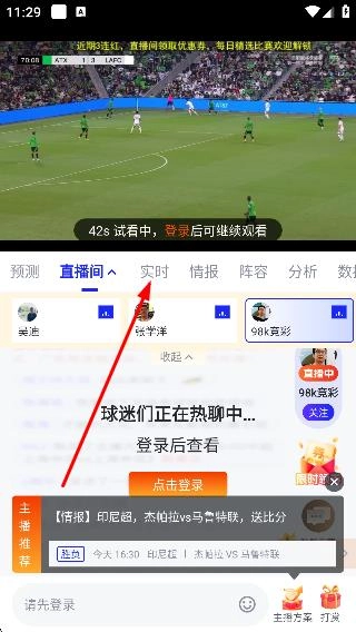 3、进入赛事详情页面后,点击【实时】选项,即可查看该赛事的实时直播内容与相关数据。
