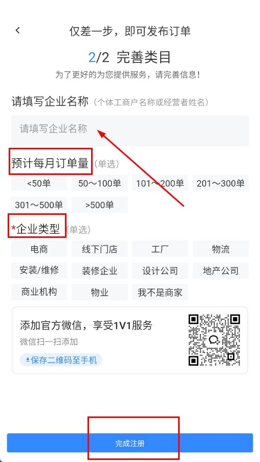 4、填写企业名称,选择预计每月订单量和企业类型,点击【完成注册】按钮,即可完成注册流程。
