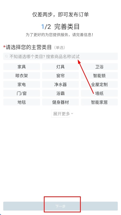 3、进入完善类目界面后,选定主营类目,再点击【下一步】按钮。