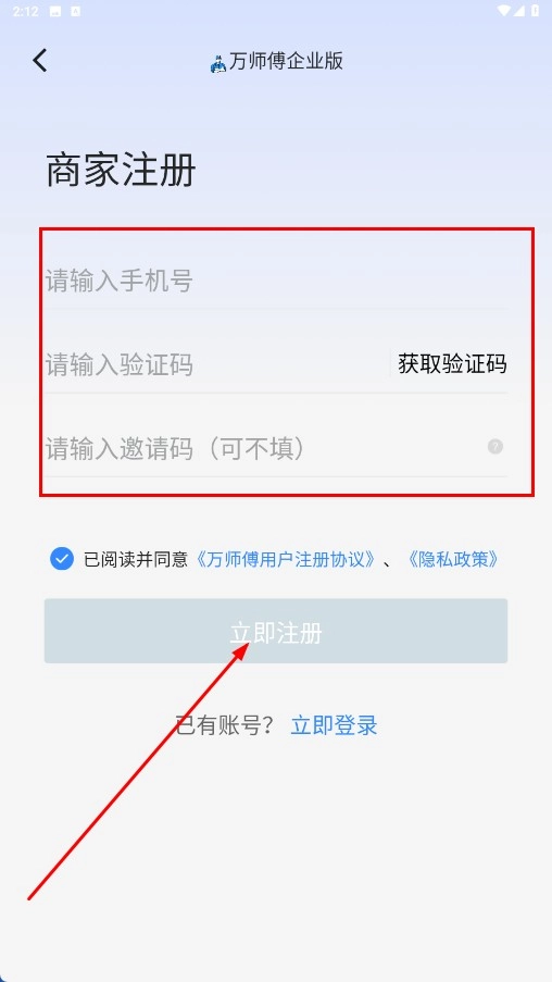 2、进入商家注册页面后,先输入手机号并填写验证码,邀请码可根据需求选择填写或不填,最后点击【立即注册】按钮即可完成注册操作。