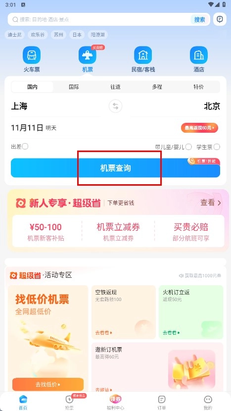 1、点击【机票-功能入口】,进入机票查询页面。