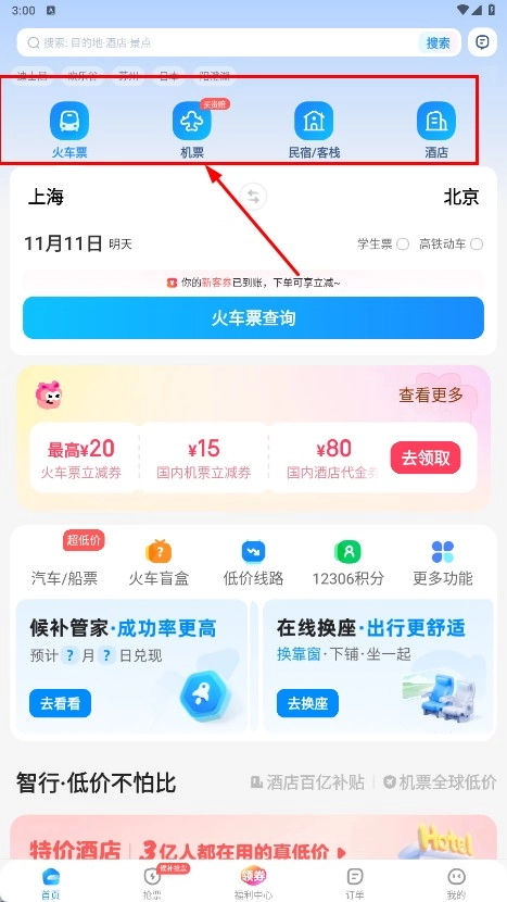 3、除此之外,智行软件还具备行程规划、酒店预订等辅助功能,能帮助用户更全面地安排自己的旅行行程。