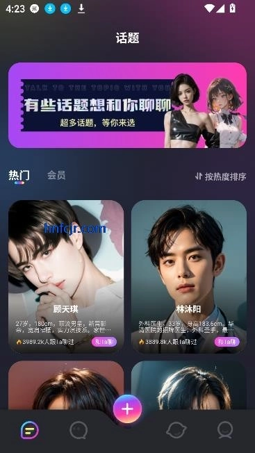 3、进入主界面后,点击【角色广场】或【热门社区】,可以通过【热门排序】查看高人气AI角色,也能选择【会员专属】标签,解锁更多精致设定与深度剧情。