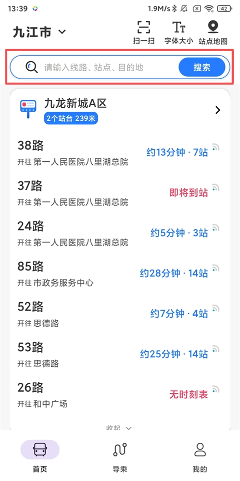 1、启动易公交应用,系统会自动定位到您当前所在的城市,随后点击界面上方的搜索框,输入您想查询的路线、站点名称或者目的地进行搜索;