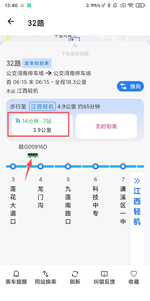 3、即可查看该路公交车的实时位置以及它与你所在站点之间的距离。