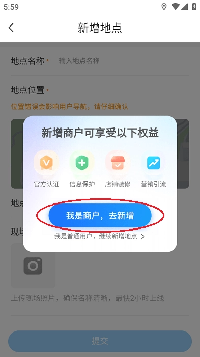 系统会提示您选择身份,请点击“我是商户,去新增”按钮;