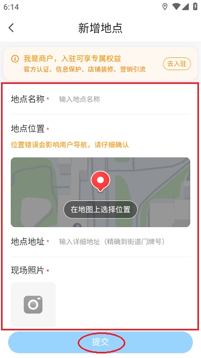 回到地图界面完善店铺的详细资料,尤其要留意定位的精准度,在确认所有信息都准确无误后,再提交进行审核。