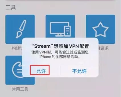 3、此时stream会弹出添加vpn配置的请求提示,点击“允许”按钮即可