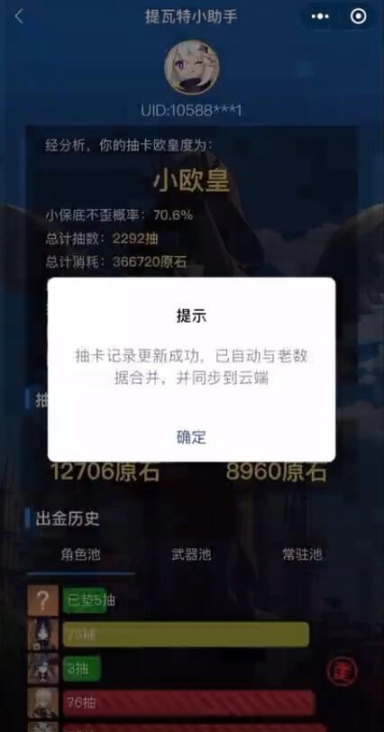 等待一段时间后,系统会提示抽卡记录已更新成功,且已自动与原有数据合并,并同步至云端。