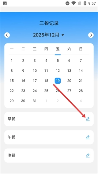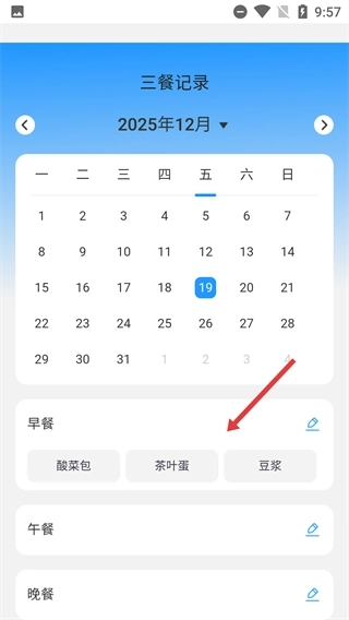 2、在【2025年12月】的日历页面,选定具体日期后,点击该日期对应餐食(例如早餐)右侧的编辑按钮,即可进入记录页面。