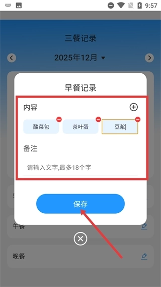 3、在【早餐记录】弹窗里,填写餐食内容(例如酸菜包-茶叶蛋-豆浆),还能补充备注信息,之后点击【保存】按钮就可以完成记录。