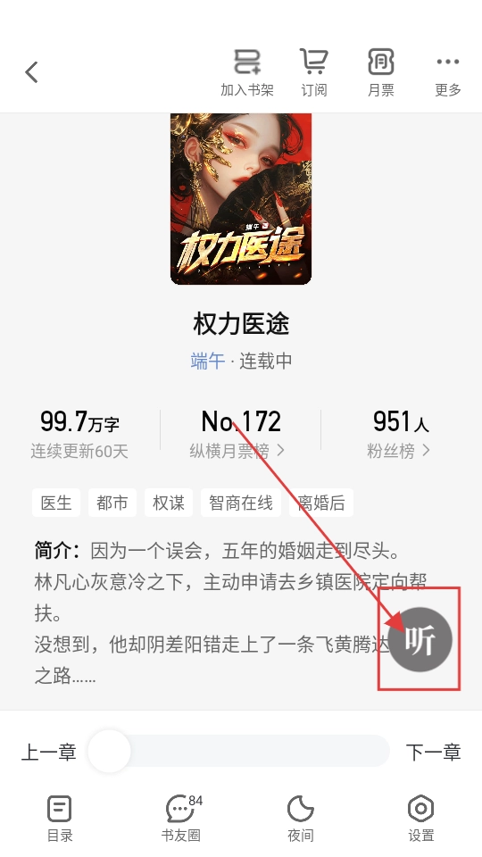 2、进入书籍详情页后,要是想收听书籍内容,点击【听】按钮,即可进入听书模式。