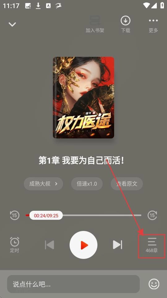 3、当处于听书模式时,如果想要查看书籍的章节内容,只需点击章节列表按钮,即可展开章节列表。