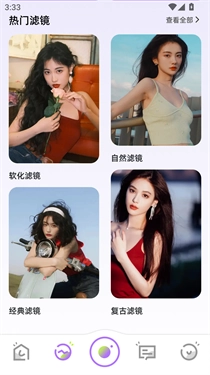 4、这款软件了海量滤镜模板,全部支持一键应用,点击界面下方中间位置的相机图标就能直接进行拍摄