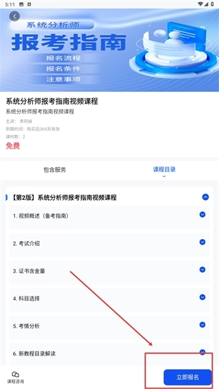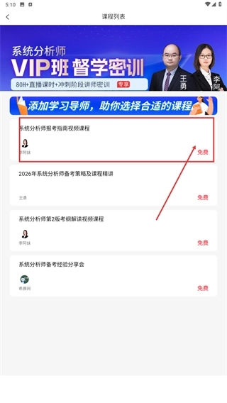 3、进入课程列表页面后,找到你想要学习的目标课程(例如系统分析师报考指南视频课程),点击该课程即可进入其详情页面。