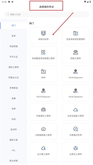 1、进入“选择我的考试”页面后,挑选目标考试(例如系统分析师),即可进入该考试对应的专属页面。