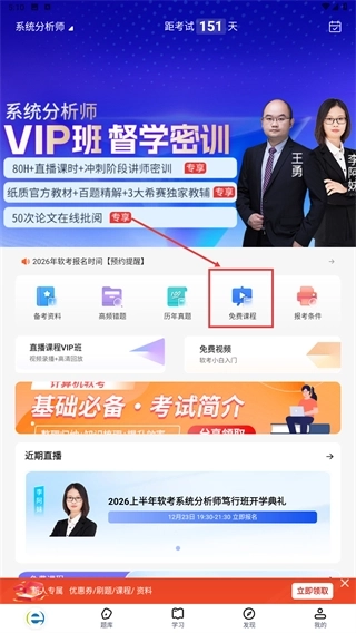 2、在考试页面,点击【免费课程】按钮,进入课程列表页面。