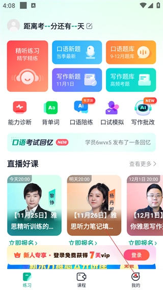 在应用首页,你可以借助【精听练习】【口语新题】这类功能板块开展雅思专项训练,点击底部的【我的】就能进入个人中心。
