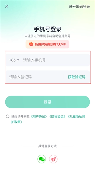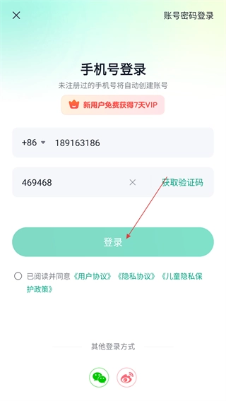 4、在输入手机号并填写验证码后,确认勾选相关协议,点击【登录】按钮就能完成账号登录操作,新用户还能免费领取7天VIP权益。