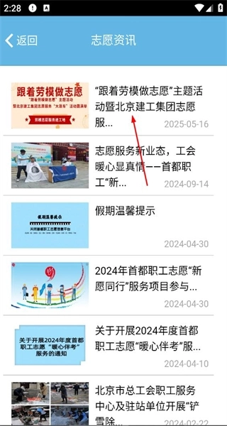 2、进入志愿资讯页面后,浏览多条志愿相关资讯,从中选择“跟着劳模做志愿”主题活动资讯,点击进入其详情页面。