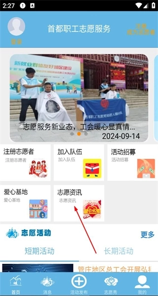 1、打开首都职工志愿服务平台进入首页,能看到注册志愿者等功能入口,点击志愿资讯选项,即可进入资讯列表页面。