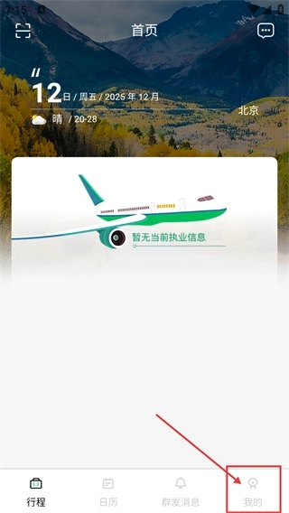 进入首页后,你能看到【2025年12月12日/周五】的日期信息,以及【北京-晴-气温20到28度】的天气情况,点击页面底部的【我的】按钮,就能进入与个人相关的页面了。