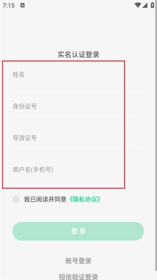 4、请选择【实名认证登录】选项,依次填写【姓名】、【身份证号】、【导游证号】和【用户名(手机号)】,就能完成登录操作。
