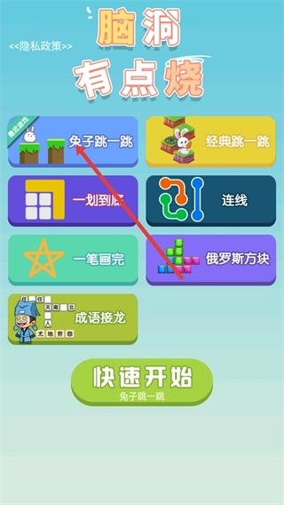 进入界面后,找到【脑洞有点烧】栏目下的【兔子跳一跳】,点击【快速开始-兔子跳一跳】即可进入游戏,同时也能查看【经典跳一跳】等其他可选项目。