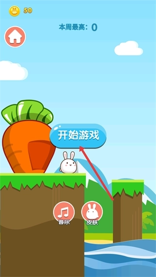 进入对应界面后,会看到【50】的数值以及【本周最高-0】的显示,点击【开始游戏】即可启动关卡,此外还能通过【音乐】和【皮肤】选项来调整相关设置。