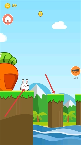 3、游戏时操控兔子跳到平台上,借助【滑板-x1】道具来辅助,注意上方【0】的数值变动,别让兔子掉落到下方区域。