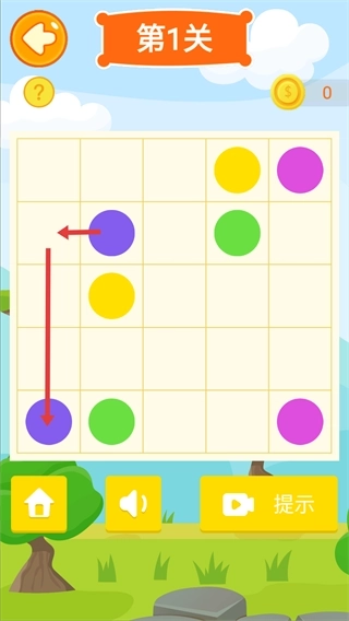 4、在连线游戏的【第1关】网格界面里,按照箭头的指示移动对应颜色的小球,要是遇到困难,可以点击【提示】按钮来获取指引,从而推进关卡。