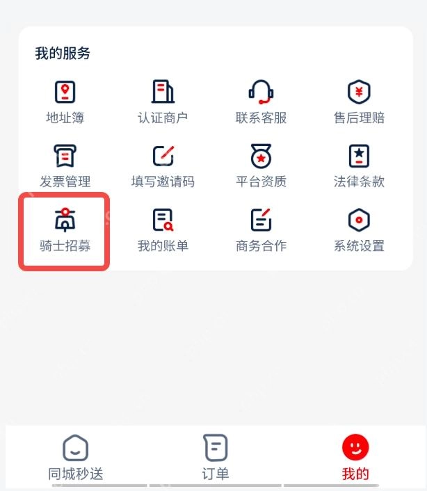4、进入个人中心页面,找到并点击【骑士招募】选项,按要求填写个人信息并提交报名申请,待审核通过后,就能正式成为京东外卖的骑手啦。