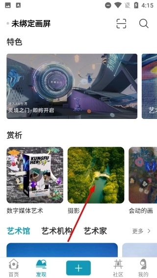 1、在“发现”页面的赏析板块中,选择【摄影】分类并点击,即可进入摄影内容的展示页面。