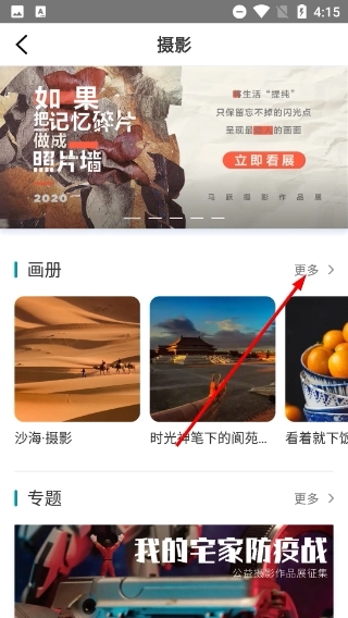 2、进入摄影页面后,找到【画册】板块,点击其右侧的【更多】按钮,即可浏览完整的摄影画册列表。