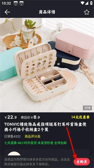 在商品详情页,点击“去购买”按钮,就能跳转到拼多多平台下单购买该商品。