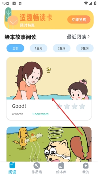 1、在“绘本故事阅读”页面挑选目标绘本(例如《Good!》),随后进入该绘本对应的学习模块选择界面。