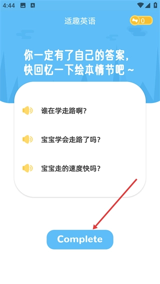4、学习完成后,页面会弹出与绘本情节相关的问题,点击【Complete】按钮即可结束该绘本的学习任务。