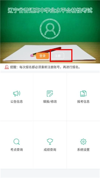 1、打开辽宁招生考试之窗,进入应用主界面后,点击【注册】按钮