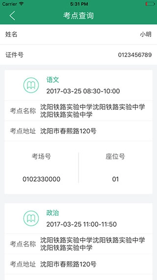 4、完成注册后,就能查看考试科目、考点名称、考点地址、考试号、座位号等详细信息了。