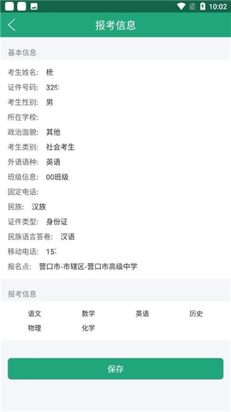 2、进入报考信息界面后,仔细确认考试相关的姓名、证件号、学校等信息无误,再点击下方的【保存】选项。