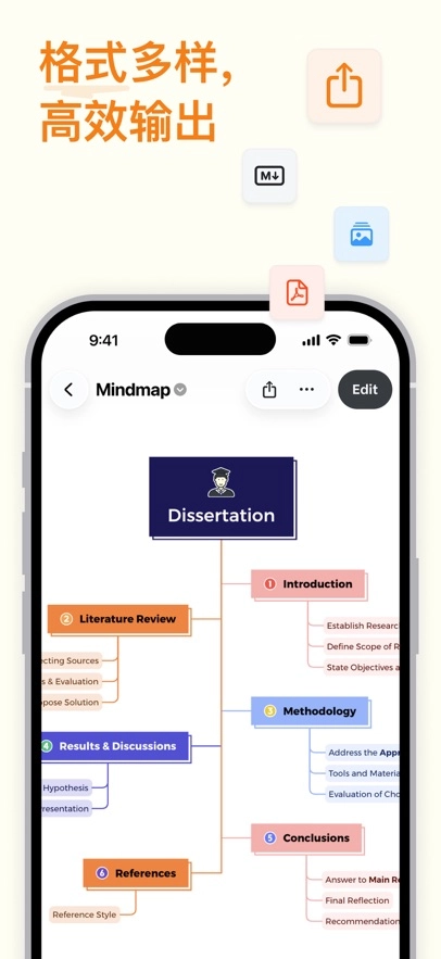 • 导出功能:可导出为PDF、PNG、Markdown、Word、Excel、PowerPoint、OPML以及TextBundle格式的文件。