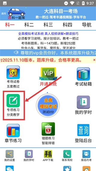 1、进入【大连科目一考场】页面后,找到并点击【专项练习-分类教学】按钮,即可进入专项练习的分类学习界面。