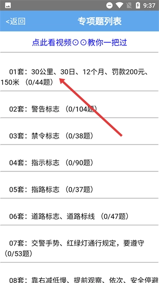 进入【专项题列表】后,可选择对应的专项套题(例如【01套-30公里-30日-12个月-罚款200元-150米】)来启动练习。