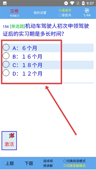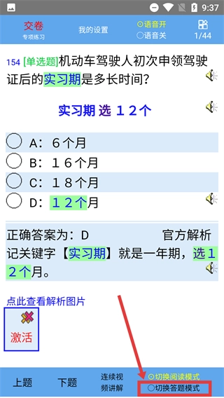4、切换到【答题模式】后,对题目选项(例如本题的【D-12个月】)进行选择,即可完成该题的答题步骤。