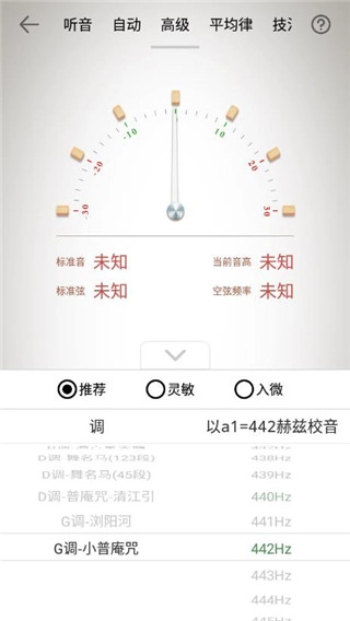 2、调音器配备了听音模式、自动定弦、高级调音、十二平均律校音、琵琶技法这5种调音模式。
