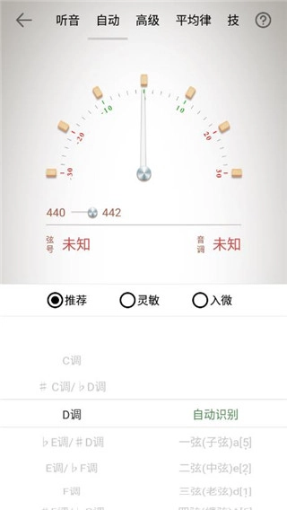 可选择“自动识别”,也可以选择“手动按弦号识别”(也就是手动从1到4弦里挑选任意一根弦)