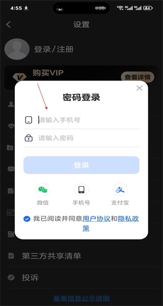 4、在密码登录页面填写手机号与密码,勾选用户协议和隐私政策后点击登录按钮,即可完成账号登录流程。