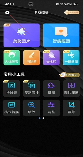 打开软件进入主界面后,能看到美化图片、智能抠图等功能选项,点击左上角的设置按钮,即可进入设置页面。