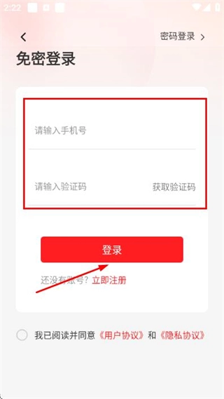 3、进入免密登录页面后,填写手机号并输入验证码,勾选相关协议,随后点击登录按钮,即可完成账号登录流程。